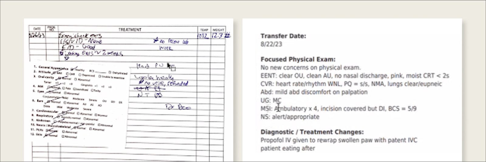 Adjusters have to wade through a lot of messy information in order to create a claim profile. These veterinary documents are often long and dense. Records differ in formats depending on the veterinary office — some even have handwritten notes. They might be as long as 50-100 pages. Hunting down relevant dates and diagnoses in these unstandardized medical documents is incredibly tedious.